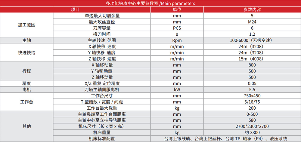 3、机床带有自动换刀系统,全封闭式防护罩,通过一次装夹同一台机床上进行铣、钻、扩、铰、攻等复合加工能力,可选配第四轴。